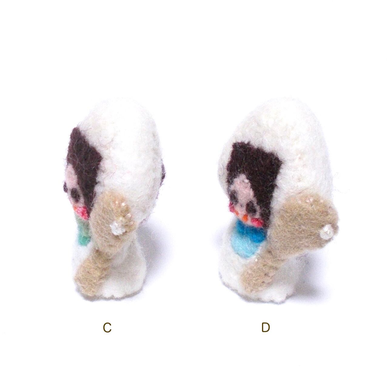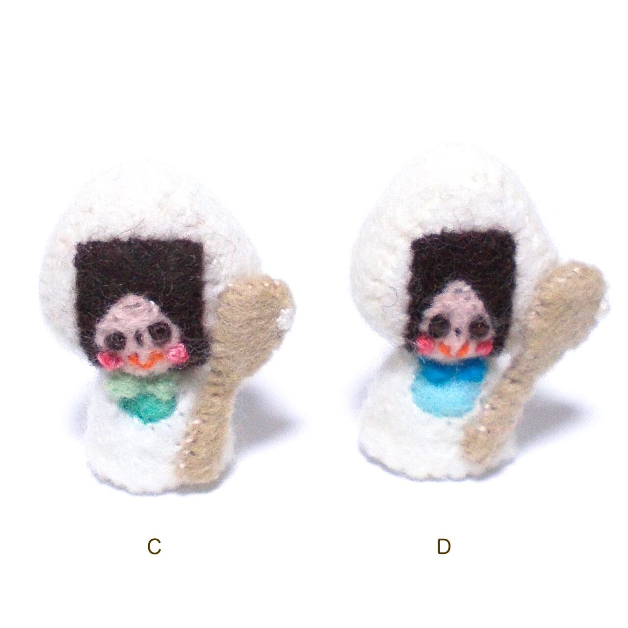 割烹着を着てしゃもじを持ったおむすびの指人形です。 ドール用のパペットとしても使用できます。 素材:シートフェルト 高さ:約 3.7 cm 指の入れ口:直径 約 1 cm