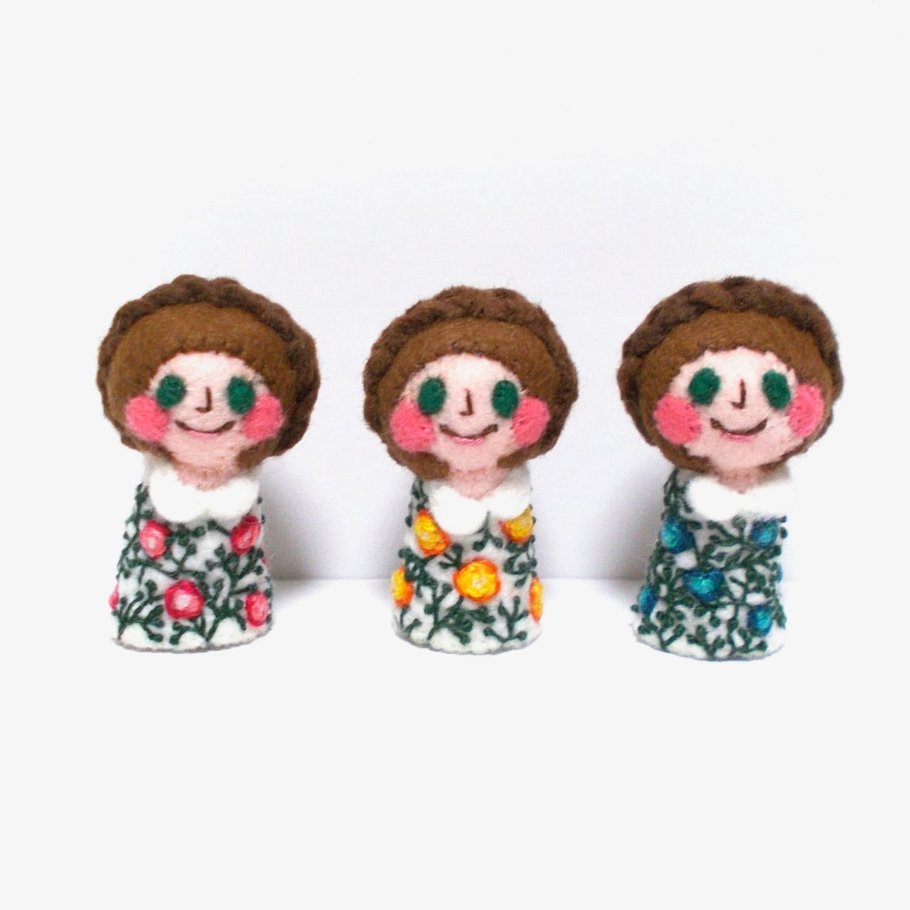 ボタニカル柄のブラウスを着た女の子の指人形です。