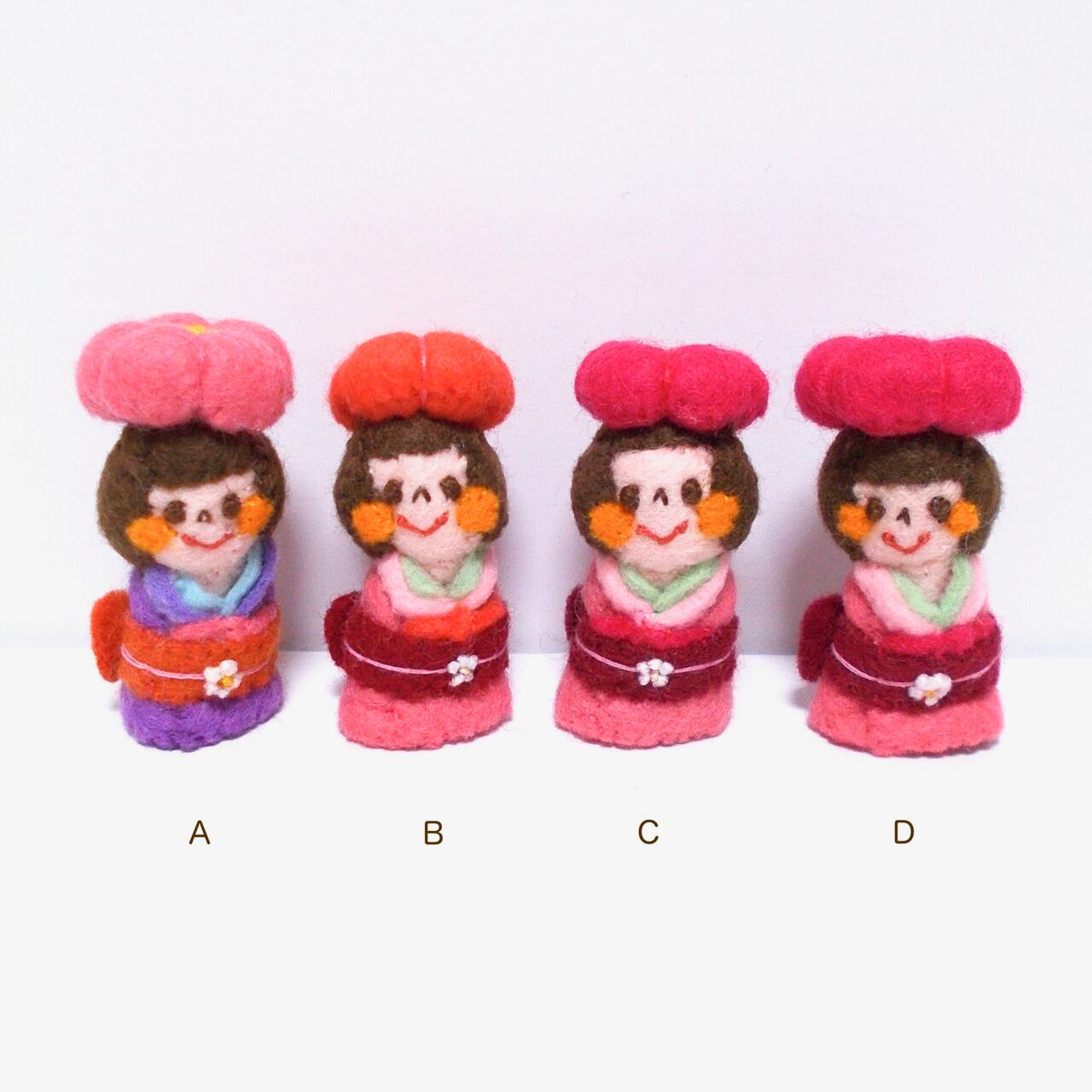 和菓子の「紅梅」をイメージした指人形です。 素材:シートフェルト 高さ:約 4.5 cm 指の入れ口:直径 約 1.5 cm