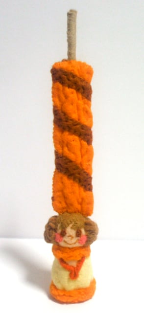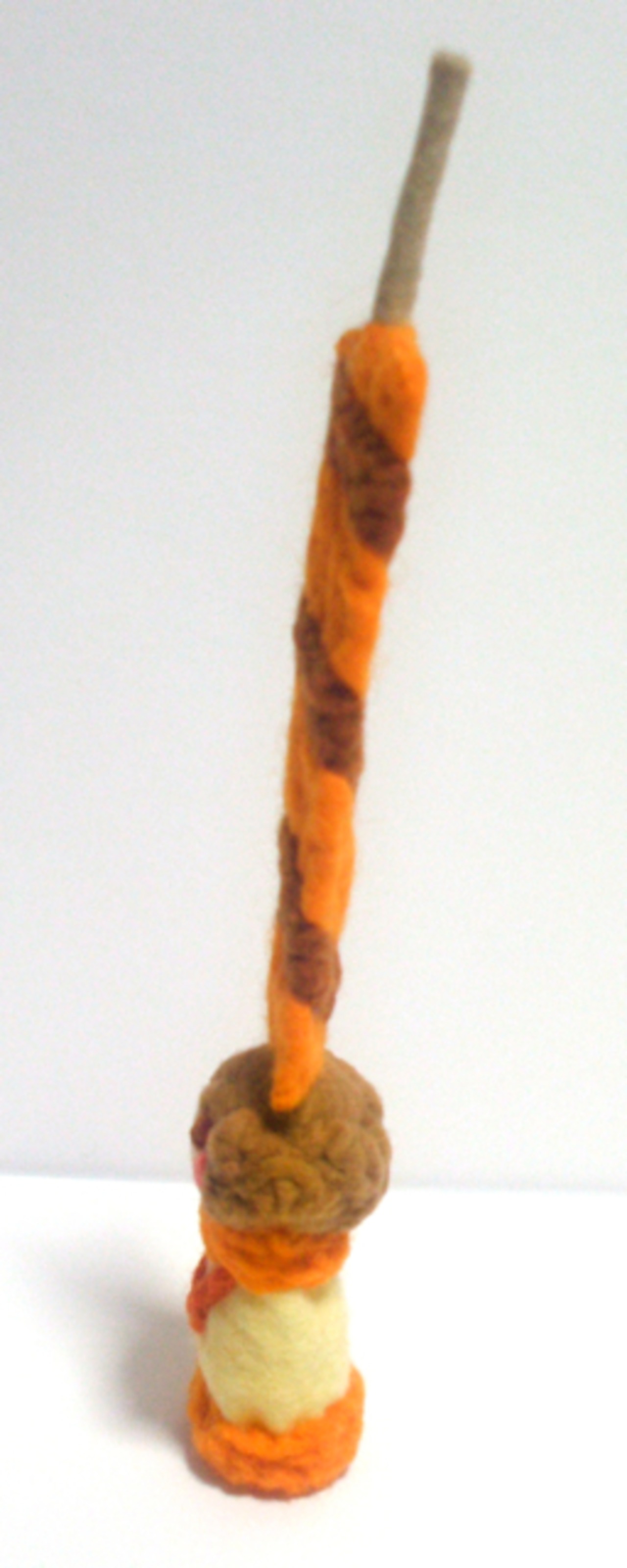 駄菓子の串カツをイメージした指人形です。 素材:シートフェルト 高さ:約17.5cm 指の入れ口:直径 約1.6cm