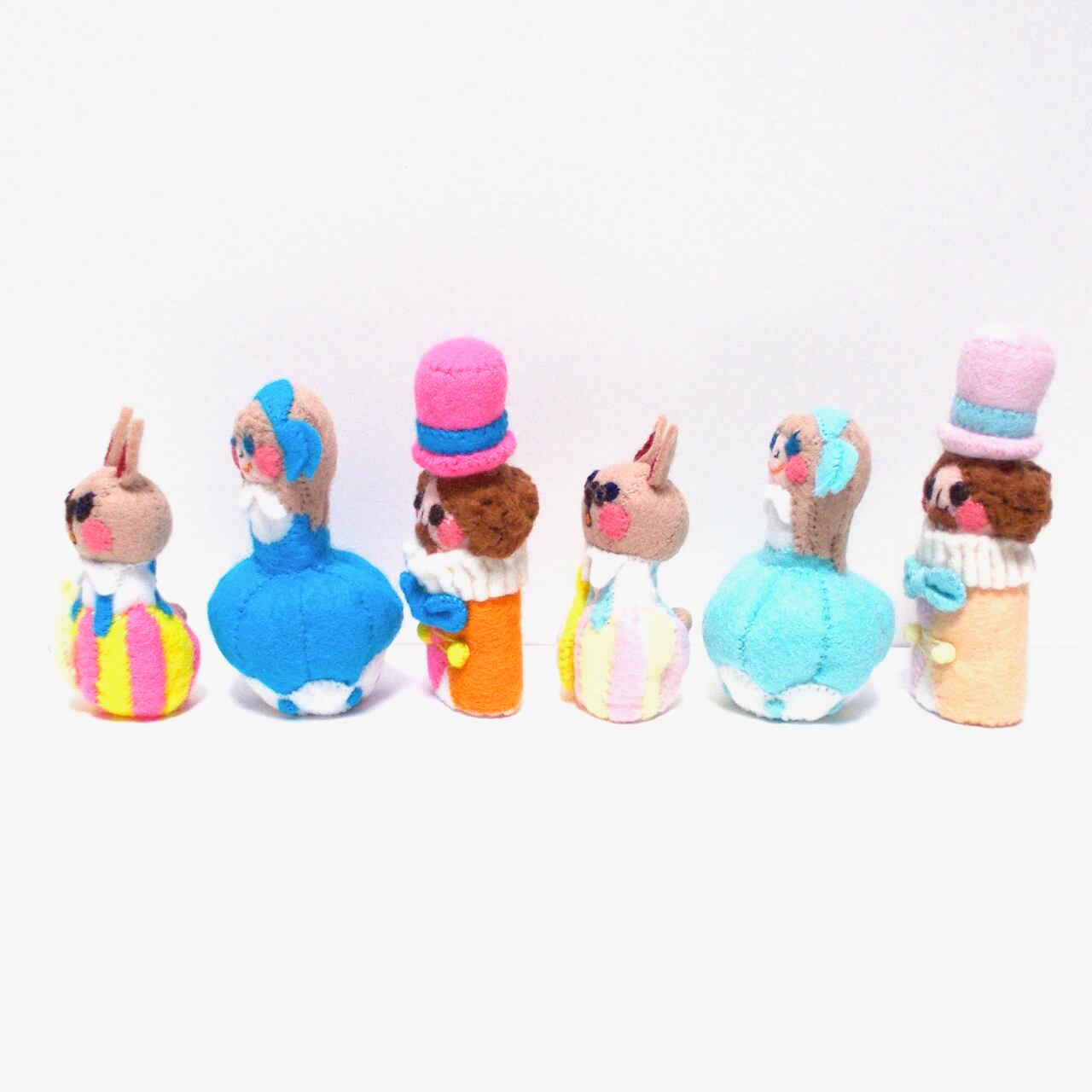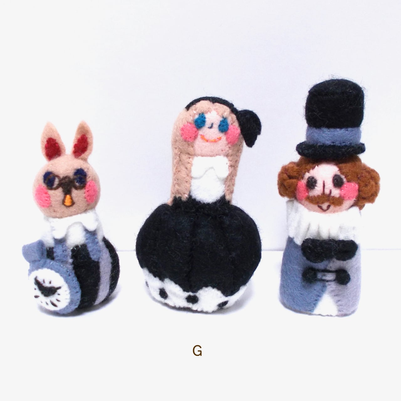 「不思議の国のアリス」のアリス・時計うさぎ・マッドハッターの指人形3体セットです。